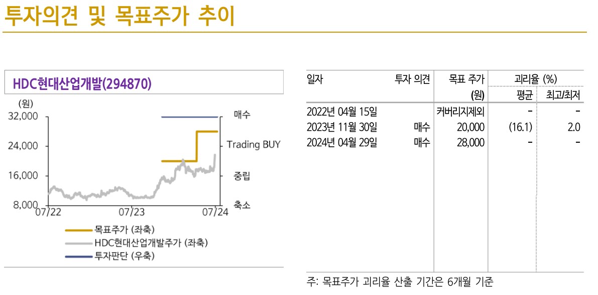 HDC현대산업개발의 목표주가는 28,000원으로 설정됨. 이는 현재 주가 대비 29.0% 상승 여력이 있는 것으로 평가됨.