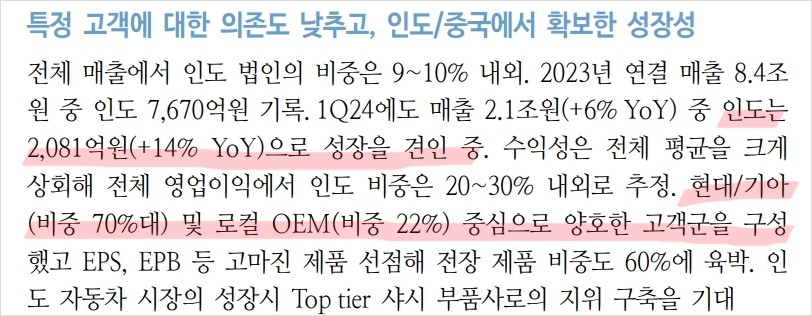 HL만도는 최근 인도와 중국 시장에서 높은 성장률을 기록하며 주목받고 있습니다. 특히 인도 시장에서 2023년 매출 7,670억원을 기록, 전년 대비 14% 성장했습니다. 전장 제품 비중이 60%에 육박하며, 고마진 제품을 선점하고 있습니다. 이러한 성장세는 24년도에도 지속될 것으로 전망됩니다. 최근 신규 수주 상황도 호조를 보이며 매출 성장에 기여하고 있습니다. HL만도는 현대/기아를 비롯한 다양한 고객사를 확보하고 있어 특정 고객사 의존도가 낮아 안정적인 매출 구조를 유지하고 있습니다.