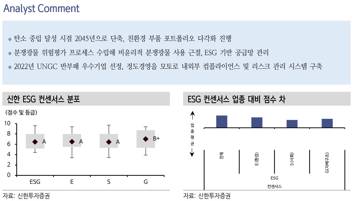 HL만도는 최근 ESG 경영을 강화하고 있습니다. 탄소 중립 달성 시점을 2045년으로 앞당기고, 친환경 부품 포트폴리오를 다각화하고 있습니다. 또한 분쟁광물 위험평가 프로세스를 수립하여 비윤리적 분쟁광물 사용을 근절하고 있으며, ESG 기반의 공급망 관리 시스템을 구축했습니다. 이러한 노력은 UNGC 반부패 우수기업 선정 등 외부에서도 인정받고 있습니다. 최근 수주 상황에서도 긍정적인 성과를 보이고 있으며, 2Q24 매출은 전년 동기 대비 4.4% 증가한 2.2조원으로 전망됩니다. 영업이익 역시 16% 증가한 895억원을 기록할 것으로 보입니다.