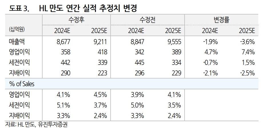 HL만도는 2024년 2분기에 영업이익 890억 원을 기록해 전년 대비 15.3% 증가할 것으로 예상됨. 글로벌 고객사의 생산 물량 회복과 중국 로컬 고객사의 물량 증가가 긍정적인 영향을 미침. 인도 시장에서의 매출 증가도 눈에 띄며, 원화 약세로 인한 환율 효과도 실적 개선에 기여함. 이로 인해 목표주가 64,000원을 유지하며, 향후 실적 개선이 지속될 것으로 보임.