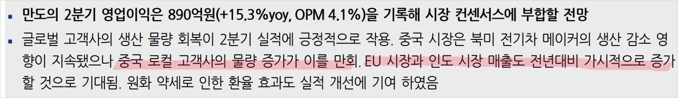 HL만도는 최근 영업이익이 크게 증가하면서 수익성 개선을 지속하고 있음. 2024년 2분기 영업이익은 890억 원으로 전년 동기 대비 15.3% 증가할 것으로 예상됨. 글로벌 고객사의 생산 물량 회복과 중국 시장에서의 물량 증가가 실적 개선에 기여함. 특히, 인도 시장에서의 고속 성장과 고부가가치 e-Product의 적용 비율 증가가 긍정적인 영향을 미칠 것임.