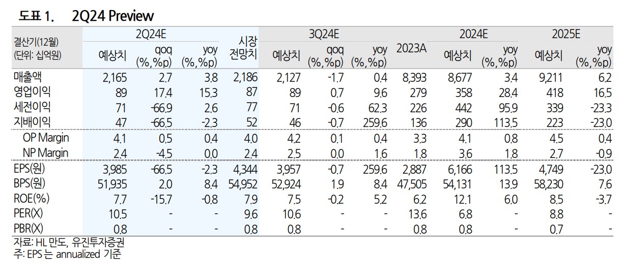 HL만도는 2024년 2분기에 영업이익 890억 원을 기록해 전년 대비 15.3% 증가할 것으로 예상됨. 글로벌 고객사의 생산 물량 회복과 중국 로컬 고객사의 물량 증가가 긍정적인 영향을 미침. 인도 시장에서의 매출 증가도 눈에 띄며, 원화 약세로 인한 환율 효과도 실적 개선에 기여함. 이로 인해 목표주가 64,000원을 유지하며, 향후 실적 개선이 지속될 것으로 보임.