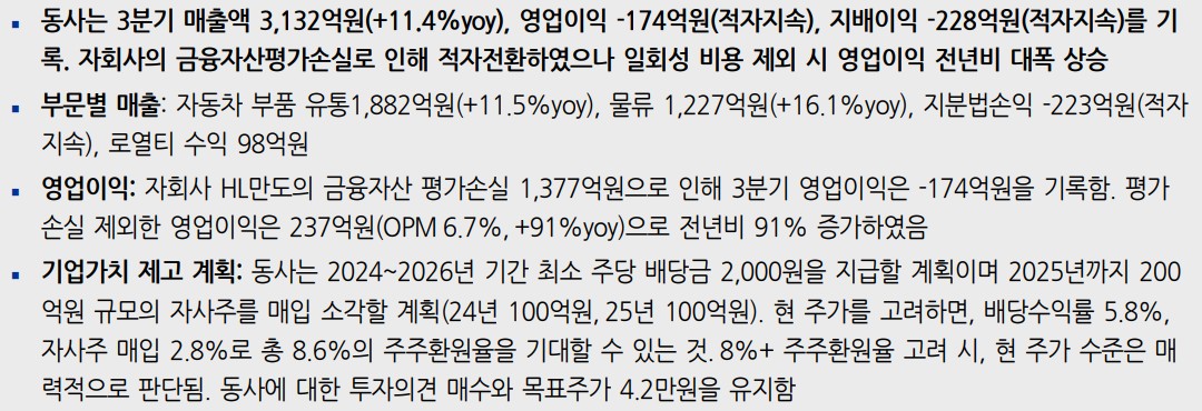 HL홀딩스는 자회사 HL만도의 금융자산 평가 손실 1,377억 원으로 3분기 적자를 기록했으나, 영업이익은 전년 대비 큰 폭으로 증가했습니다. 자동차 부품 유통과 물류 부문의 매출이 각각 11.5%, 16.1% 증가하며 안정적인 실적 흐름을 보이고 있습니다. 동사의 강점은 안정적인 현금흐름과 이를 활용한 적극적인 주주환원 정책입니다. 배당금 정책과 자사주 매입은 주주가치를 높이는 데 기여하고 있으며, 주가는 현재 목표 주가 대비 저평가된 상태입니다.