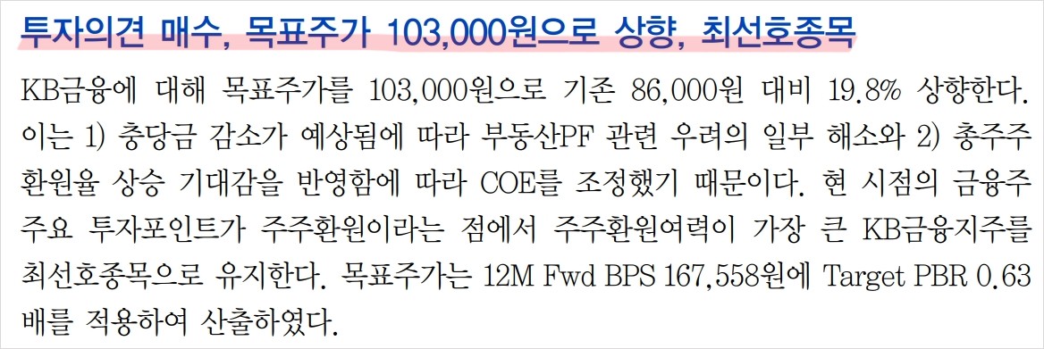 KB금융의 목표주가는 103,000원으로 설정됨. 이는 현재 주가 대비 18.4%의 상승 여력이 있음.