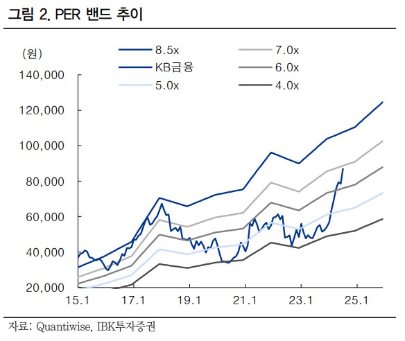 KB금융의 주가는 향후 긍정적인 흐름이 예상됨. 총주주환원율 40%를 기대하며, 이는 주가 상승의 주요 요인으로 작용할 것임. 추가적인 자사주 매입 및 소각 발표가 예상되며, 이는 주가에 긍정적인 영향을 미칠 것임.