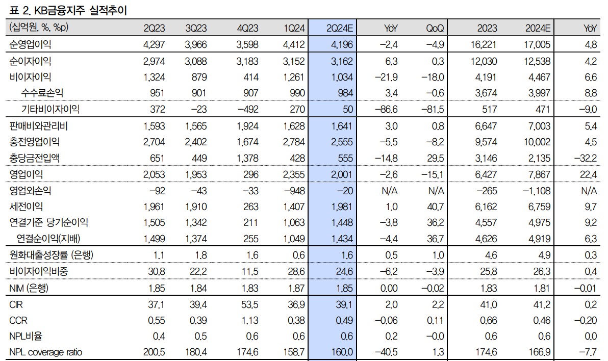 KB금융의 2분기 지배주주순이익은 1조 4,337억원으로 예상됨. 이는 전년 동기 대비 4.4% 감소, 전 분기 대비 36.7% 증가한 수치임. 원화대출은 1분기 대비 1.6% 증가, NIM은 2~3bp 하락 예상됨. 비이자이익은 증권과 카드 부문의 양호한 실적 덕분에 양호한 수준 예상됨. 부동산PF 관련 대손충당금은 1분기 대비 증가할 것으로 보이지만 큰 영향은 없을 것으로 보임.