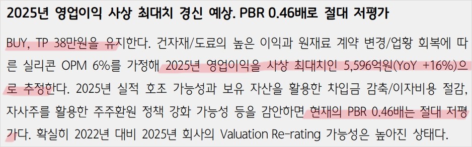 KCC는 실리콘 사업부의 흑자 전환, 건자재 및 도료 부문의 안정적인 성장, 경쟁사의 가격 인상과 글로벌 수요 회복 등의 긍정적인 요인들이 맞물려 2025년 사상 최대 실적을 기록할 것으로 예상됨. 주가는 긍정적인 흐름을 이어갈 것으로 전망되며, 목표 주가는 380,000원으로 설정됨. 투자 판단은 본인의 판단과 책임하에 이루어져야 함.