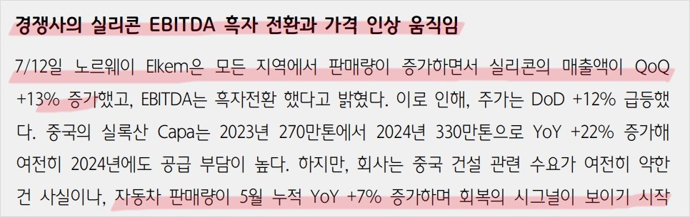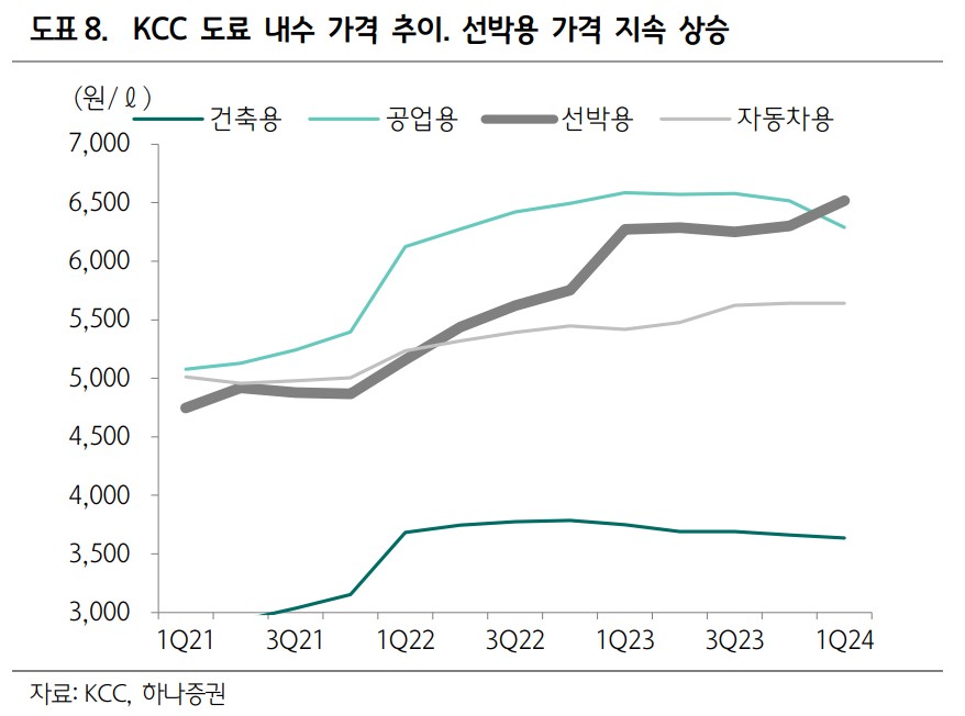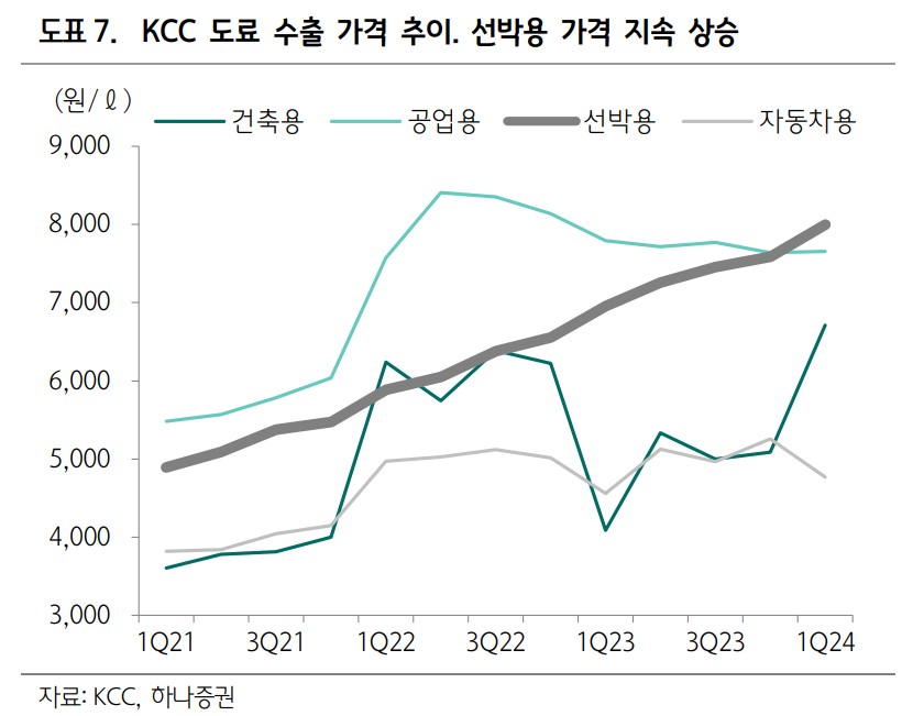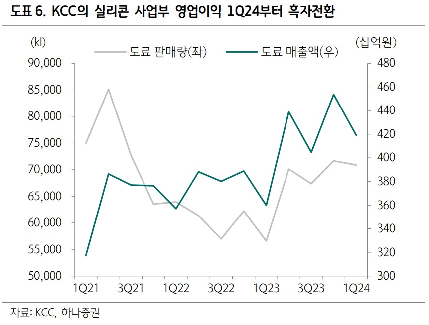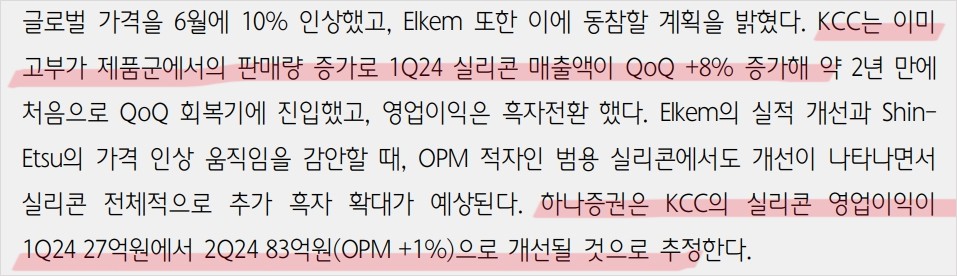 KCC는 최근 노르웨이 Elkem의 실리콘 매출 증가와 흑자 전환에 따라 긍정적인 영향을 받고 있음. Elkem의 주가는 하루 만에 12% 상승했으며, KCC의 실리콘 사업부 매출액도 1분기부터 증가세를 보임. 중국의 실록산 생산량 증가는 공급 부담을 가중시키지만, 자동차 판매량 증가와 유럽/미국의 수요 회복세가 긍정적인 신호로 작용하고 있음. Shin-Etsu의 가격 인상에 동참하며 실리콘 사업부 전반에 걸쳐 흑자 확대가 예상됨.