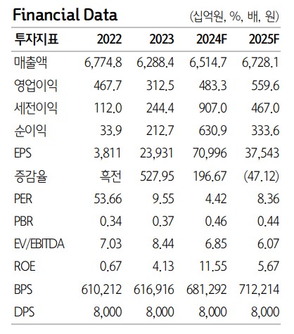 KCC의 2023년 매출액은 6,288.4억원, 영업이익은 312.5억원을 기록함. 2024년과 2025년에는 각각 매출액 6,514.7억원, 6,728.1억원과 영업이익 483.3억원, 559.6억원을 달성할 것으로 예상됨. 부채비율은 2023년 145.13%에서 2024년 116.72%, 2025년 112.63%로 감소할 전망. PER은 2023년 9.55배에서 2024년 4.42배로 개선될 것으로 보임.
