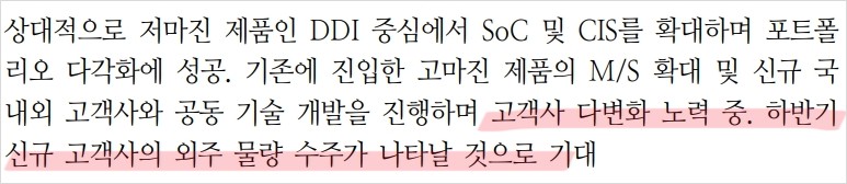 LB세미콘은 2024년 상반기 신규 고객사 확보와 기술 개발에 집중하고 있음. 최근 발표된 보고서에 따르면, DDI 중심에서 SoC 및 CIS로 포트폴리오를 다각화하며 매출 및 수익성 개선을 기대할 수 있음. 또한, 2분기부터 영업이익 흑자전환이 가능할 것으로 보임. 국내외 신규 고객사와의 협력으로 외주 물량 수주가 예상되며, 이를 통해 하반기 실적 개선이 예상됨.