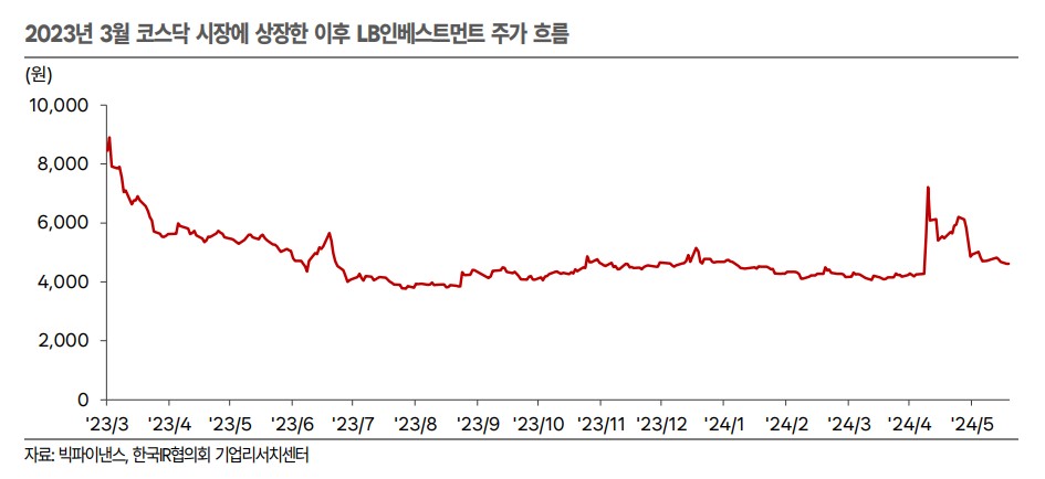 LB인베스트먼트의 주가는 최근의 수주 확대와 기술 개발 성과에 힘입어 상승세를 보일 것으로 예상됨. 특히, IT 융합 및 바이오/헬스케어 분야에서의 포트폴리오 성과가 주가에 긍정적인 영향을 미칠 것으로 보임. 2024년 목표 주가는 6,000원으로 제시됨.