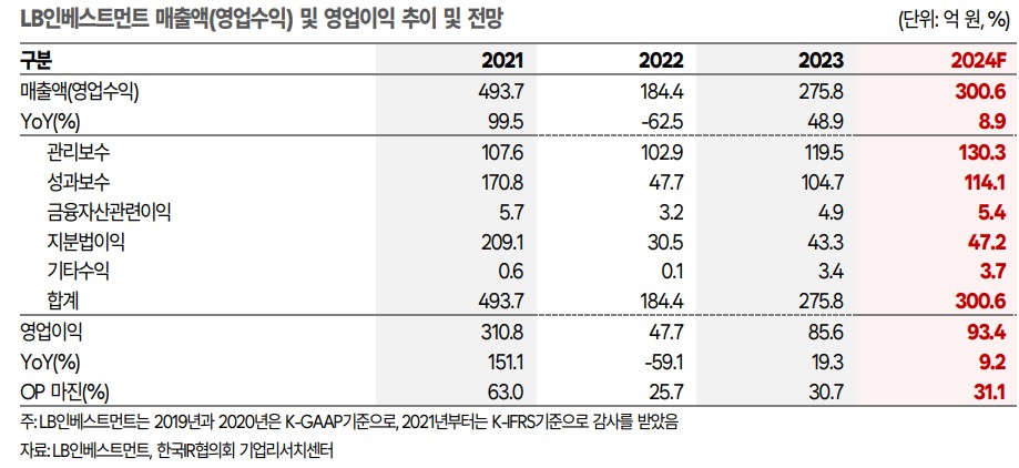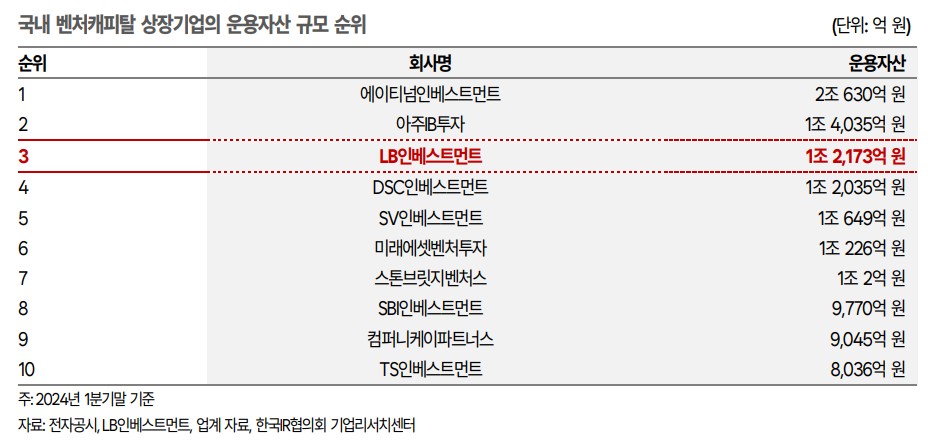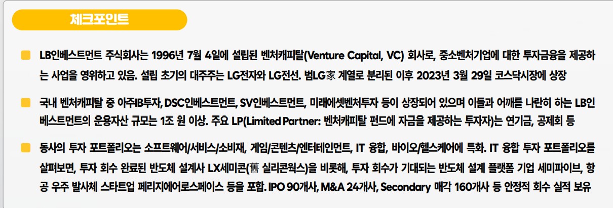 LB인베스트먼트는 1996년 설립된 벤처캐피탈로, 2023년 코스닥에 상장됨. 2024년 예상 매출액은 301억 원, 영업이익은 93억 원으로 전망됨. 최근 IT 융합 및 바이오/헬스케어 분야에서 강세를 보이며 성과를 내고 있음.