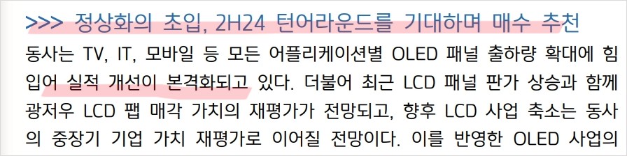 LG디스플레이는 OLED 사업부를 중심으로 실적 개선을 기대할 수 있는 기업임. 최근 2분기 실적에서 영업적자를 크게 축소하며 긍정적인 신호를 보였음. 하반기에는 신제품 출하량 증가와 함께 흑자전환이 기대됨. 목표주가는 16,000원으로 설정되었으며, 이는 OLED 사업부의 성장과 실적 개선을 반영한 것임. 투자에 대한 모든 책임은 본인에게 있음을 명심하시기 바람.