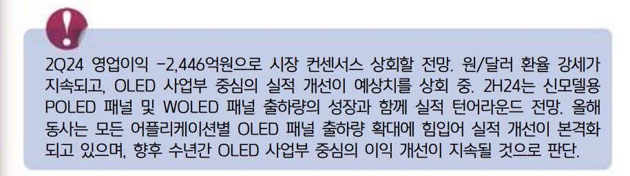 LG디스플레이의 주가는 OLED 사업부 성장과 함께 상승할 가능성이 큼. 하반기 흑자전환이 기대되며, 신제품 출하량 증가가 주가 상승을 견인할 것으로 보임. 단기적으로는 원/달러 환율 변동에 주의해야 함.