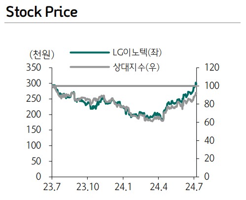 LG이노텍의 주가는 하반기에도 상승할 가능성이 높음. 북미 고객사의 차기 모델 출시와 AI 기술의 발전으로 인한 매출 증가가 예상됨. 특히 광학솔루션 부문에서의 성장이 주가 상승의 주요 요인이 될 것임.