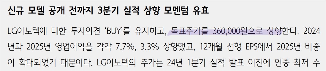 A. LG이노텍의 목표주가는 360,000원으로 상향 조정됨.