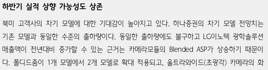 LG이노텍은 2분기 실적에서 좋은 성과를 보였으며, 하반기에도 북미 고객사의 차기 모델 출시에 따른 매출 증가가 예상됨. 특히 광학솔루션 부문에서 큰 성과를 기대할 수 있음. 기판소재 및 전장 부품 부문도 안정적인 성과를 유지할 것으로 보임.