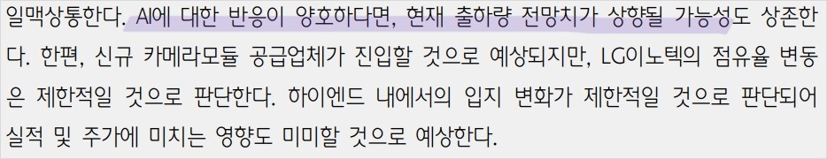 최근 LG이노텍은 북미 고객사의 차기 모델에 대한 기대감이 높아지고 있음. 차기 모델에 폴디드줌 기술이 확대 적용될 예정이며, 울트라와이드 카메라의 화소수가 상향될 것으로 보임. AI 반응이 긍정적이라면 현재 출하량 전망치가 상향될 가능성도 있음. 신규 카메라모듈 공급업체 진입이 예상되지만, LG이노텍의 점유율 변동은 제한적일 것으로 보임.