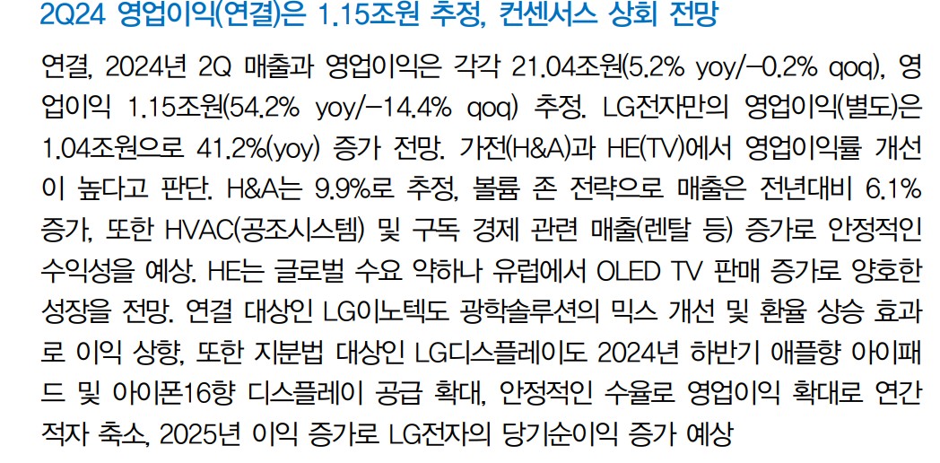 LG전자는 최근 2분기 영업이익이 1.15조원으로 예상치를 상회하며 좋은 실적을 기록했음. 가전과 TV 부문의 영업이익률이 예상보다 높아져 실적이 개선됨. 특히, OLED TV와 북미 지역의 HVAC(공조시스템) 및 구독 경제 관련 매출 증가가 실적 향상에 기여함. 또한, 반기 배당 실시와 B TO B 사업 강화 전략이 긍정적으로 평가받고 있음. 엔비디아 등 AI 분야에 집중된 수급이 LG전자로 다변화될 것으로 기대됨.