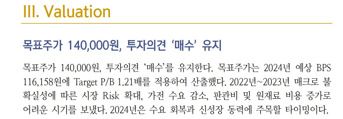 LG전자의 목표주가는 140,000원으로 제시됩니다. 이는 AI와 전장 사업의 성장을 반영한 것으로, 향후 주가 상승의 주요 요인이 될 것입니다. LG전자는 지속적인 혁신과 글로벌 시장에서의 경쟁력 강화를 통해 주가 상승을 견인할 것으로 예상됩니다.