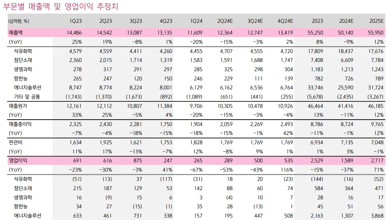 LG화학은 최근 다양한 사업 부문에서 긍정적인 실적을 기록하며 주목받고 있음. 특히 배터리 부문인 LG에너지솔루션의 성장이 돋보임. 최근 몇 년간 LG화학은 석유화학과 첨단소재, 생명과학 부문에서 견고한 매출을 유지하며 시장에서 입지를 굳히고 있음. 2023년에는 글로벌 시장에서의 경쟁력을 강화하기 위해 다양한 전략적 파트너십과 기술 혁신을 추진하였음. 이러한 노력 덕분에 LG화학은 2024년에도 안정적인 성장이 예상됨.