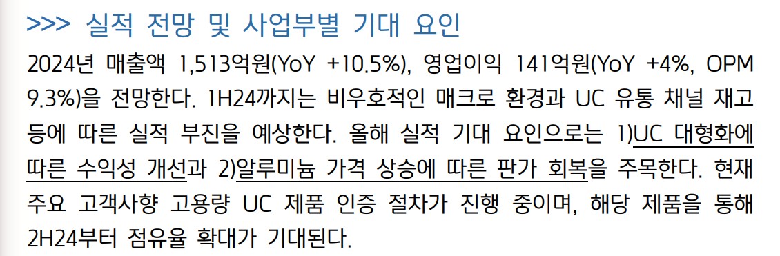 - 주요 고객사향 고용량 UC 제품 인증 절차가 진행 중이며, 해당 제품을 통해 2H24부터 점유율 확대가 기대됨.