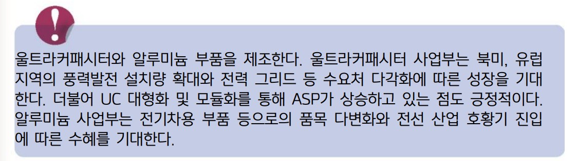 - 울트라커패시터 사업부는 UC 대형화 및 모듈화를 통해 수익성이 개선되고 있음.
