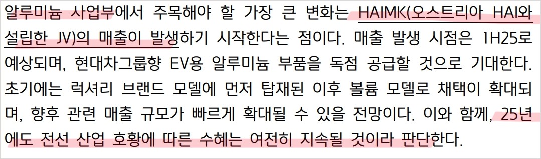 - 알루미늄 사업부는 전기차용 부품 등으로의 품목 다변화와 전선 산업 호황기에 따른 수혜를 기대하고 있음.