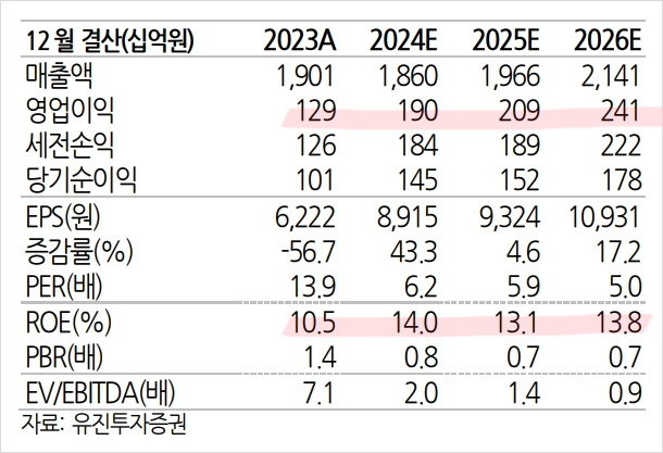 2024년 매출은 1조 8,600억 원으로 소폭 감소할 전망이나, 2025년 매출은 1조 9,665억 원으로 반등할 것으로 보임. 2025년 EPS는 9,324원으로 예상되며, ROE는 13.1%로 안정적인 수준을 유지할 것으로 평가됨.
