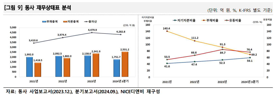 N스틸의 최근 매출은 국내 건설 경기 둔화로 감소했으나, 영업수익성은 양호한 수준을 유지하고 있다. 부채비율은 69.2%로 안정적이며, 2024년 3분기 기준 매출은 2,128억 원으로 전년 대비 감소했다. 유동비율은 76.4%로 단기 유동성은 열위하지만, 강재리스 사업의 지속적인 성장이 이를 보완할 것으로 보인다.