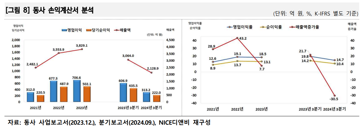 A. 2024년 3분기 기준 매출이 전년 동기 대비 30.5% 감소했으나, 강재리스와 신제품 매출이 긍정적인 흐름을 보이고 있습니다.