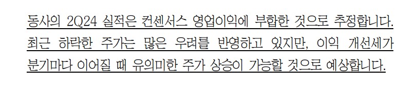 최근 NHN은 다양한 사업에서의 성과를 보였습니다. 2Q24 실적 발표에서 매출액 6,299억 원, 영업이익 251억 원을 기록하며, 이는 시장의 기대에 부합했습니다. 게임 부문은 비수기 영향으로 QoQ 10% 감소했으나, 결제 및 광고 부문에서의 성장이 두드러졌습니다. 결제/광고 매출액은 전년 동기 대비 17% 증가했으며, 일본 MSP 사업의 호조로 기술 매출액도 4% 성장했습니다. 커머스 부문은 사업 구조 조정을 통해 수익성 개선이 두드러졌습니다. 특히 페이코 관련 손실이 눈에 띄게 축소되고 있어 긍정적인 신호로 작용할 것입니다. NHN의 전략적 사업 재편과 수익성 개선 노력은 앞으로의 주가 상승을 견인할 중요한 요소가 될 것입니다.