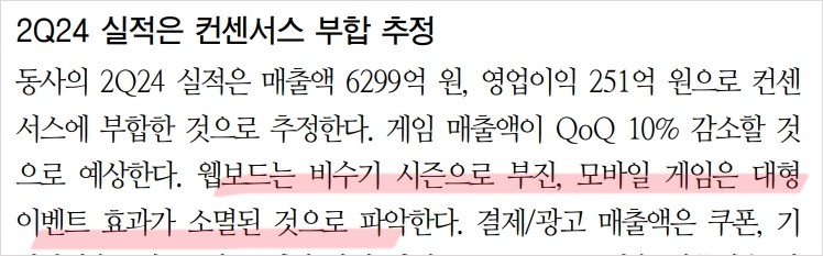 NHN은 다양한 디지털 서비스와 플랫폼을 제공하는 기업으로, 게임, 결제, 광고, 커머스 등 여러 분야에서 활동하고 있습니다. 최근 2Q24 실적은 매출액 6,299억 원, 영업이익 251억 원으로 추정되며, 이는 컨센서스에 부합하는 성과입니다. 게임 매출액은 QoQ 10% 감소했지만, 결제/광고 매출액은 YoY 17%, 기술 매출액은 YoY 4% 성장했습니다. 커머스 매출액은 659억 원으로 수익성 통제 전략이 두드러졌습니다. 올해 NHN의 실적 개선은 커머스 사업 회복에 달려 있습니다. 주요 사업 부문에서의 성장이 기대되며, 주가 상승의 모멘텀이 될 것입니다.