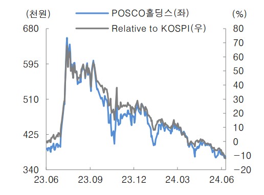 자회사인 포스코인터내셔널과 포스코퓨처엠이 2차전지에 몰빵을 하고 자빠졌으니 2차전지 섹터가 쭉~ 빠지면서 같이 빠지는 것.