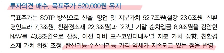 포스코홀딩스는 철강업계에서의 강력한 입지와 함께 친환경 인프라 및 이차전지 소재 사업에서의 성장 가능성도 높음. 최근의 실적 감소에도 불구하고, 장기적인 성장 전망은 긍정적임. 투자에 있어서는 이러한 점을 고려하여 신중한 접근이 필요함.