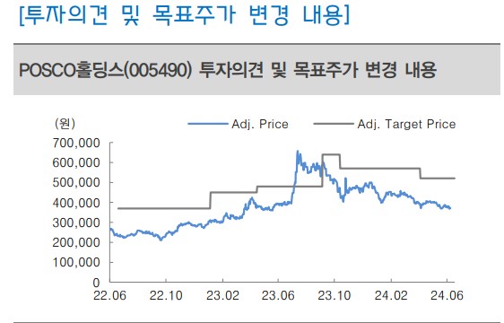 포스코홀딩스의 목표주가는 520,000원으로 설정되었으며, 이는 현재 주가 대비 약 40.2% 상승 여력이 있음. 이는 철강 및 친환경 인프라 사업의 성과와 이차전지 소재 사업의 확장 가능성에 근거함.