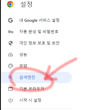 4. 왼쪽 사이드바에서 "검색엔진"을 클릭합니다. 5~6번째에 검색엔진 버튼 있더라구요. 아래 이미지대로 찾아보셔요. 버전마다 조금 달라요.