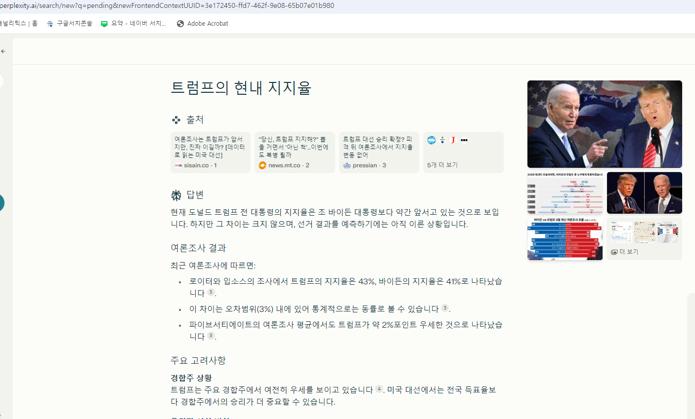 크롬 주소창에 트럼프 지지율이라고 검색을 해보면 트럼프지지율에 대한 최신정보가 바로 나옵니다. Perplexity는 검색을 할 때 영어로 검색한 후 한국어로 번역하면 훨씬 더 최신의 정확한 정보를 보여준다고 하니 참고해주세요. ^^