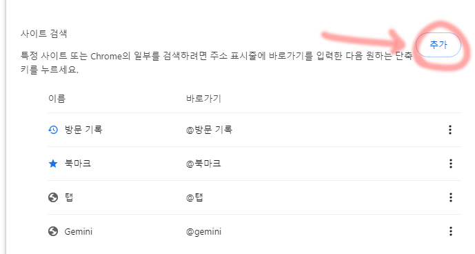 6. "검색엔진 추가" 버튼을 클릭합니다. 이 버튼은 "사이트 검색" 섹션 아래에 있습니다.