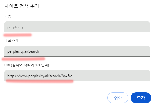 쓰기 번거로우시면 위 내용 그대로 복사하셔도 됩니다. 다 입력하신 후 "추가" 버튼을 클릭하여 Perplexity AI를 검색엔진 목록에 추가합니다.