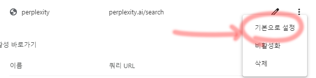 8. 이제 추가된 Perplexity AI 옆의 세 개의 점(⋮)을 클릭하고 "기본값으로 설정"을 선택합니다.