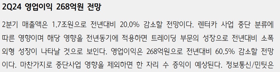 SK네트웍스는 최근 사업 구조 개편을 통해 자산 효율성을 높이고 있음. SK렌터카 매각으로 인해 이익 감소가 예상되지만, 매각 대금으로 차입금 상환이 가능해 이자 비용 절감 효과가 기대됨. 특히, AI 연관 사업으로의 진출 가능성도 주목받고 있음. 2분기 매출액은 1.7조원으로 전년 대비 20% 감소할 전망이나, 이는 렌터카 사업 중단에 따른 영향임. 트레이딩 부문의 성장이 기대되며, 정보통신 및 민팃 부문은 감익이 예상됨. 워커힐과 스피드메이트는 긍정적 흐름을 이어가고 있음. 엔코아는 인수 이후 흑자 전환이 기대됨.