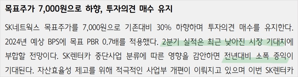 SK네트웍스의 주가는 최근 사업 구조 개편과 AI 사업 진출 가능성으로 긍정적인 전망이 나옴. 렌터카 사업 매각으로 인한 재무 구조 개선이 기대되며, AI 연관 사업의 구체적인 진행 상황에 따라 주가가 상승할 가능성이 있음. 2024년 목표 주가는 7,000원으로 설정됨.