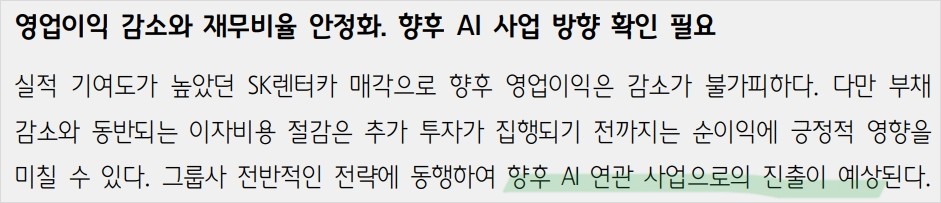 A. SK렌터카 매각과 AI 사업 진출 가능성이 주요 이슈로 부각되고 있음.