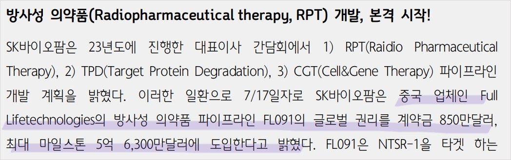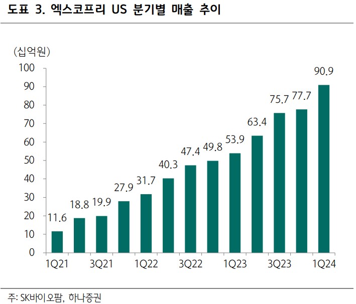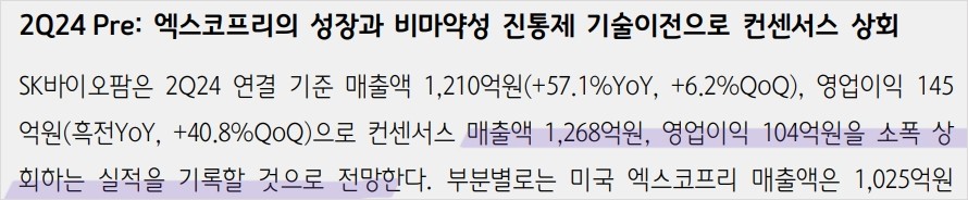 SK바이오팜은 최근 2분기 매출액 1,210억원을 기록하며 전년 대비 57.1% 증가했고, 영업이익은 145억원으로 흑자 전환에 성공함. 주력 제품인 엑스코프리의 매출이 지속적으로 성장 중이며, 비마약성 진통제 기술이전에 따른 계약금 300만달러가 반영됨. 엑스코프리 매출은 1,025억원으로 전년 대비 61.7% 증가함. 또한, 신규 방사성 의약품 파이프라인 개발에 박차를 가하며 미래 성장 동력을 확보하고 있음.