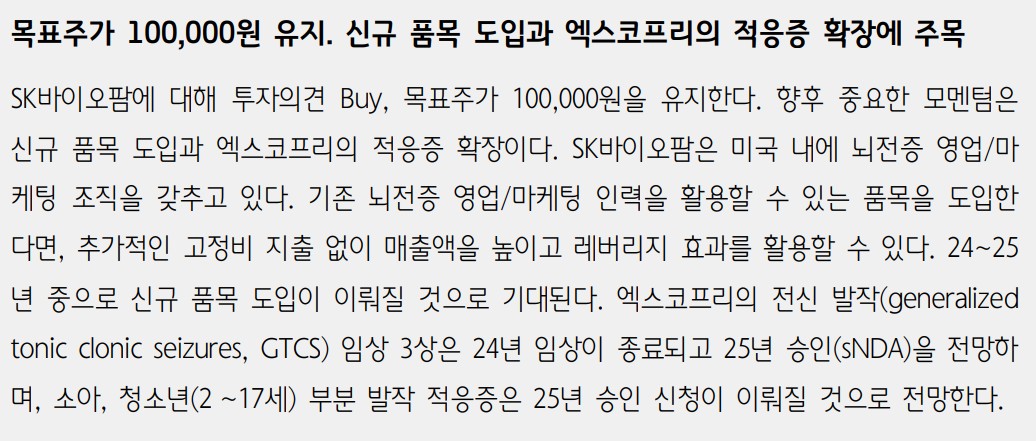 SK바이오팜의 목표주가는 100,000원으로 제시되었으며, 이는 현재 주가 대비 약 17.5% 상승 여력이 있음. 이는 성공적인 실적 개선과 더불어 원가율 개선이 이루어진다면 충분히 달성 가능한 목표임.
