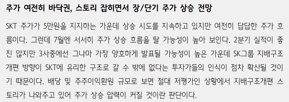 SK텔레콤은 최근 지배구조 개편 이슈로 인해 주목받고 있습니다. SK그룹의 지배구조 개편은 SK텔레콤에 유리한 방향으로 진행될 것으로 예상되며, 이는 주가에 긍정적인 영향을 미칠 것입니다. 또한 SK텔레콤은 높은 배당금 지급을 유지할 가능성이 높아 투자 매력도가 큽니다. 최근 2분기 실적도 통신 3사 중 가장 양호할 것으로 전망되며, 이는 주가 상승에 긍정적인 요인으로 작용할 것입니다. 현재 주가는 바닥권에 머물러 있지만, 지배구조 개편과 실적 호조로 주가 상승이 기대됩니다.