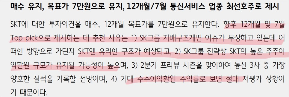 SK텔레콤은 최근 지배구조 개편 이슈로 투자자들의 관심을 받고 있습니다. SK그룹의 지배구조 개편은 SK텔레콤에 유리한 방향으로 진행될 가능성이 높으며, 이는 주가 상승의 호재로 작용할 수 있습니다. 또한 SK텔레콤은 높은 배당금 지급을 유지할 가능성이 높아 투자 매력도가 큽니다.