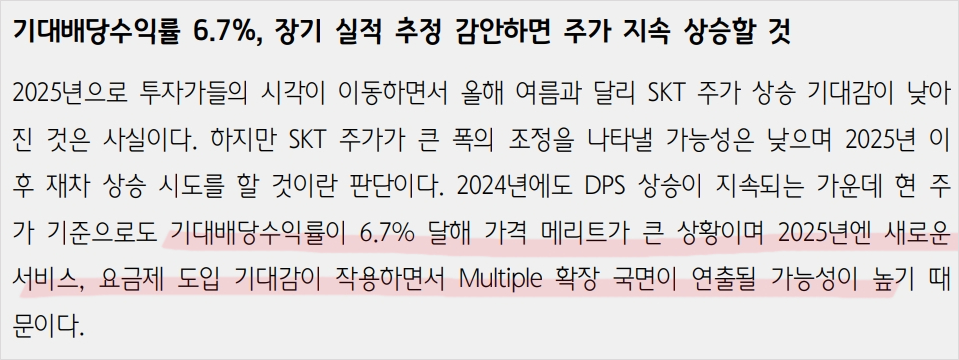 SK텔레콤은 안정적인 배당 정책과 효율적인 비용 관리를 통해 투자 매력을 유지하고 있습니다. 현재 주가 상승 여력은 약 23%로 평가되며, 목표주가는 70,000원입니다. 장기적으로 5G 서비스 확대와 신규 서비스 도입이 주요 성장 동력으로 작용할 것으로 보입니다. 2024년 이후 비용 감소와 수익 구조 다각화가 기대되며, 배당 안정성과 함께 장기적인 주가 상승 가능성이 높습니다.