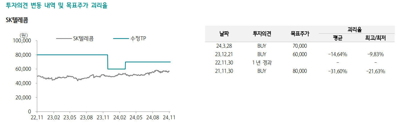 SK텔레콤은 안정적인 배당정책과 꾸준한 이익 성장세를 바탕으로 투자자들의 관심을 받고 있습니다. 최근 5G 가입자 증가 둔화와 비용 상승에 따른 이익 정체가 우려되지만, 장기적으로 새로운 요금제와 서비스 도입이 기대되고 있습니다. 목표주가는 70,000원으로 설정되어 있으며, 현재 주가 대비 상승 여력이 약 23%로 평가됩니다.
